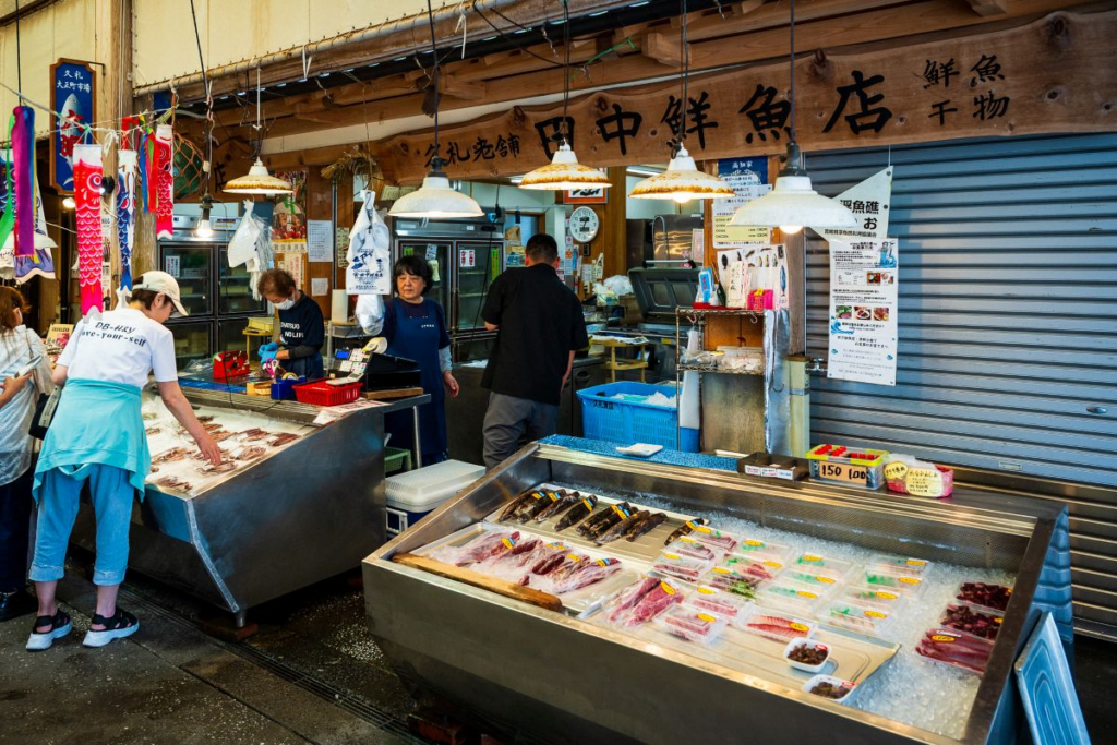 From Tosa-Kure Station, it’s about a 10-minute walk to Taisho-Machi Market, a lively place in this small town, where locals and tourists alike come to shop for food products and eat some of the freshest katsuo and other fish in the area. At the far end of the market from the street is Tanaka Sengyoten, a fish shop that has been in business for over 100 years. The motto at Tanaka is “No Katsuo, No Life,” and indeed, you haven’t really lived until you taste the freshly prepared katsuo tataki from this nationally famous shop. Apart from the regular condiments, Tanaka offers its own secret sauce that brings out the fresh flavors of their tataki.