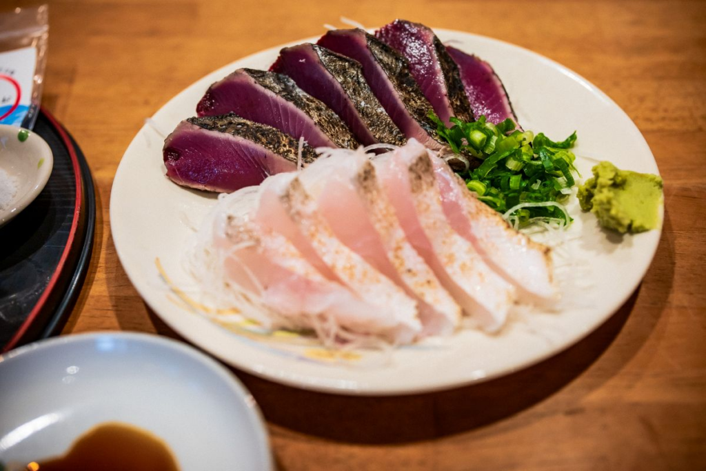 In Kochi, freshly caught katsuo is the star ingredient in one of the prefecture’s most famous dishes, katsuo tataki, a form of sashimi that has been slightly seared over a straw-fueled fire. The smoke enhances the flavor of the fish while the searing enhances the texture. Katsuo tataki is served on its own with simple condiments that can be combined to personal tastes: sea salt, garlic slices, wasabi, and ponzu (a light, citrusy soy sauce). The secret to Kochi’s katsuo tataki is in its freshness; the fish doesn’t have time to develop a fishy flavor when eaten so quickly after being caught.