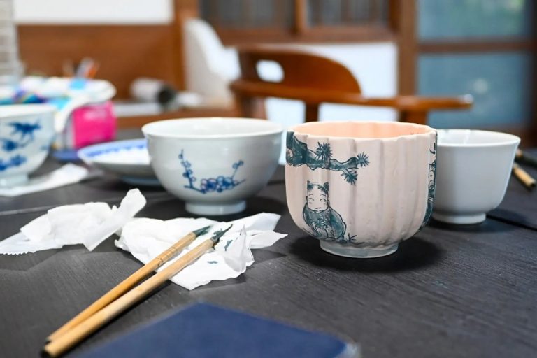 The hands-on etsuke experience takes visitors through the final steps of Mikawachi ware making, where skilled shokunin (master craftsmen) use brushes to apply blue paint in different dilutions, creating intricate designs from nature and legend. We created a deep bowl with a karako design, a representative iconography from this region.