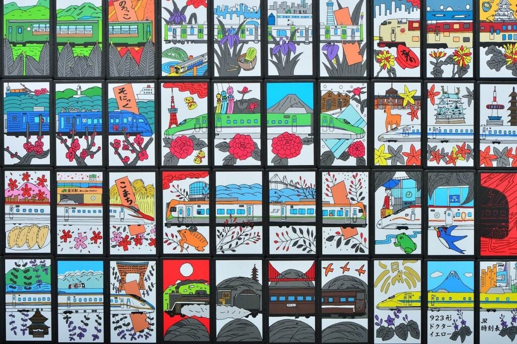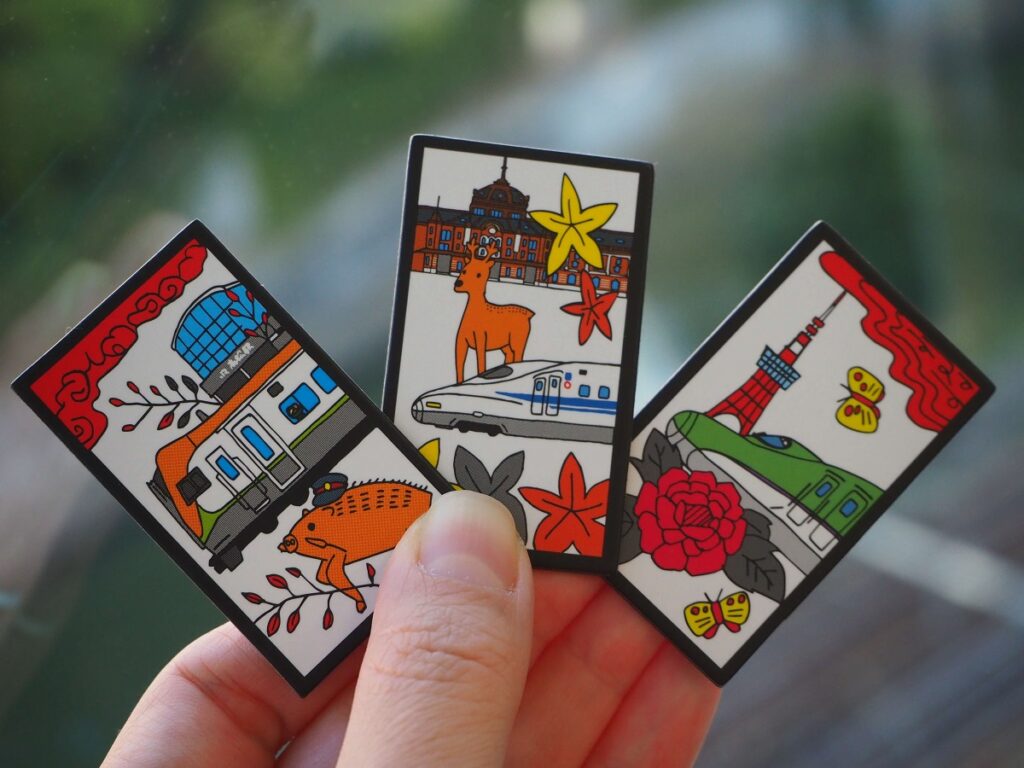 There are 48 cards, consisted of 12 months (suits) with 4 cards each. Each month is associated with the design of Japanese trains and seasonal flowers or plants. For example, March is associated with a design of Komachi train (Akita Shinkansen) and Cherry blossoms.