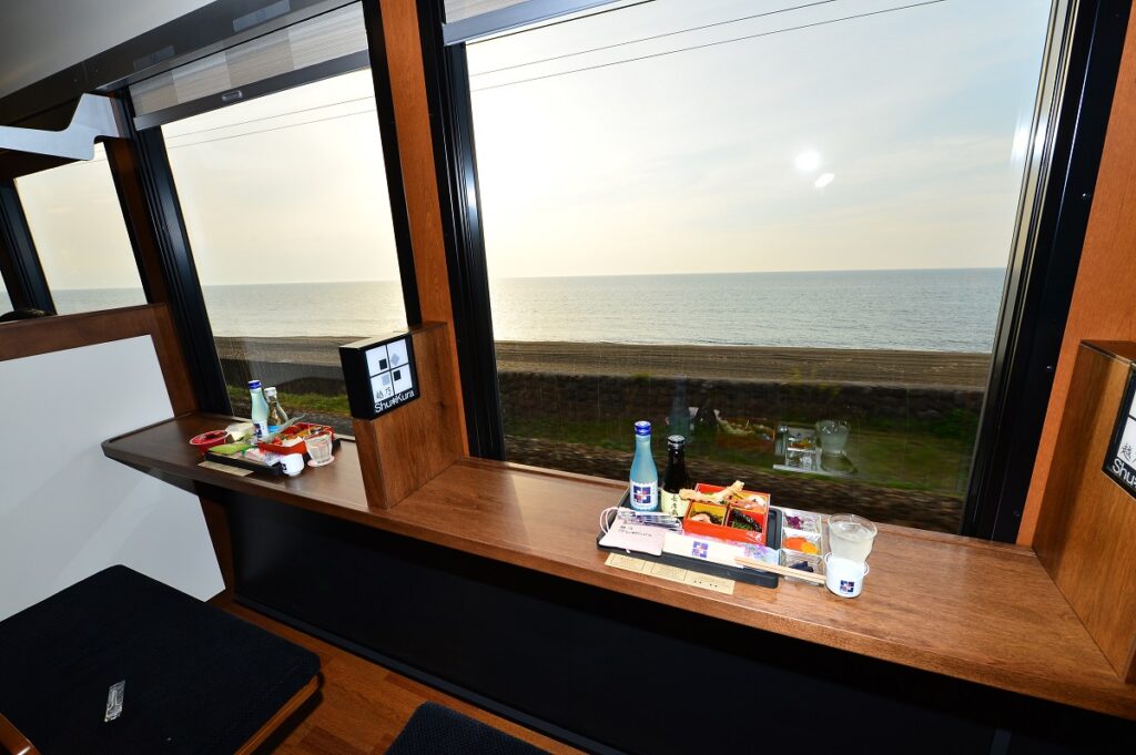 The color of the exterior features the deep blue of aishitaguro, formed with Japanese traditional indigo dyeing, with a white line that evokes snow and rice. In the observation train car, there are box seats for groups, pairs of viewing seats facing the big windows, and pairs of relaxing seats that allow comfortable sitting.