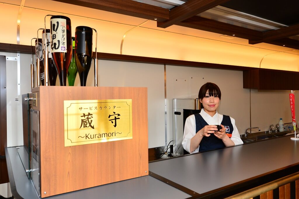 Sake tastings featuring a careful selection of choice Niigata sake as well as otsumami snacks with local ingredients are offered onboard, and there are also performances of jazz, classical, or other music and tastings with other alcoholic beverages. Local sake is available for free in the first car (the car for groups) and the third car, while the second car has the service counter Kuramori where paid sake tastings can be enjoyed featuring five regular varieties.