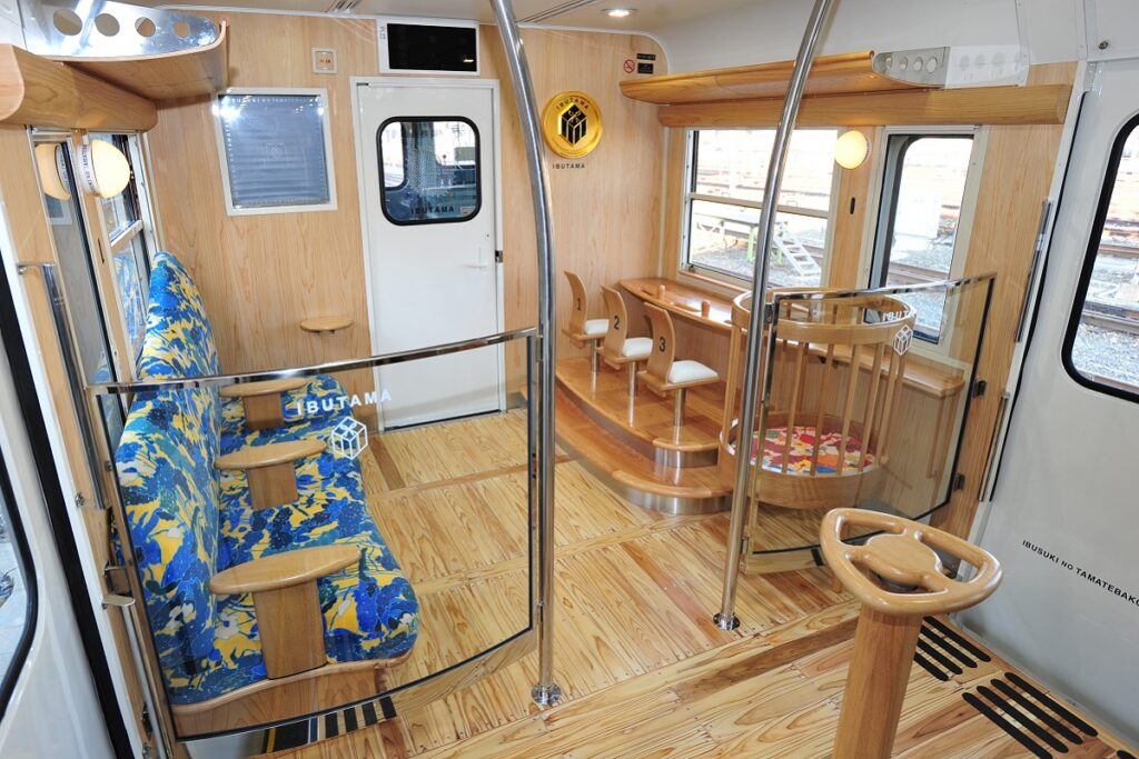 The comfortable train interior features an abundance of wood materials such as cedar and teak. It also has facilities to help provide pleasant journeys to passengers of all ages, including kids’ chairs, playpens, and books.