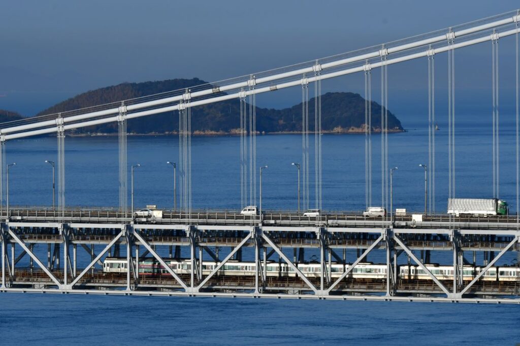 The Great Seto Bridge is a collective name for six bridges that span the approx. 9.4 km (approx. 5.8 miles) across the strait, and that include several types of bridges, including suspension bridges, cable-stayed bridges, and truss bridges. The bridges have a two-tier structure, with the upper section carrying the road (Seto-Chuo Expressway) and the lower section carrying the railway (JR Honshi-Bisan Line), which makes it one of the largest combined road and rail bridges in the world.