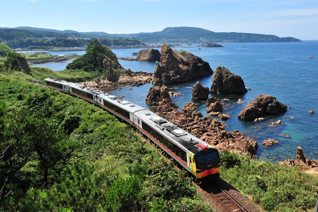 The Resort Shirakami is a sightseeing train that runs on the Gono line, with views of Shirakami Sanchi, a registered World Natural Heritage site, and the beautiful Sea of Japan coastline.