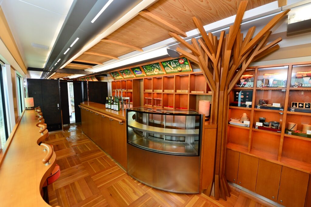 The Buna, which debuted in 2016, uses a lot of wood that is grown in the areas surrounding the railway line, such as Japanese cedar and hiba (a type of cypress), in its interior, giving an impression of warmth. In the third car there is a counter where you can buy specialty goods from the areas through which the railway line runs, such as local sake, coffee, and confections.
